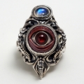 素材:SILVER、COPPERほか 石:ガーネット、ロイヤルブルームーンストーン サイズ:H約37mm×W約23mm 眼はガーネット、その上にロイヤルブルームーンストーンをアレンジしました。 眼のまぶたをオリハルコンに、ほかはすべてシルバー製です。 ※お届けまで2~3か月ほどお時間をいただく場合がございます。 ※詳細はこちらの特集へ。 ザ・プラネット・パラミータ > リング > 炎の眼 (ほのおのめ) - シルバー×オリハルコン