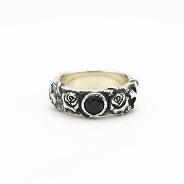 中央にラウンドカットのブラックスピネルを覆輪留めで配置。