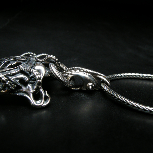 ヘッドパーツの「Dragon Head」は取り外しが可能。チェーンの通し穴は約4.2mmです。お持ちのチェーンをお使いいただけますが、チェーン自体の太さだけでなく、キャッチの大きさにもご注意ください。