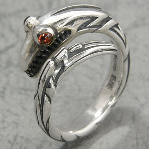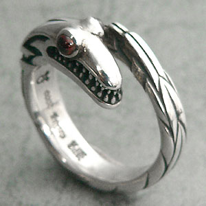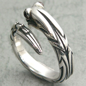 ポップでありながら、アンティークなテイストを加味させている。指に巻きつくようなトライバルなデザインのリング。