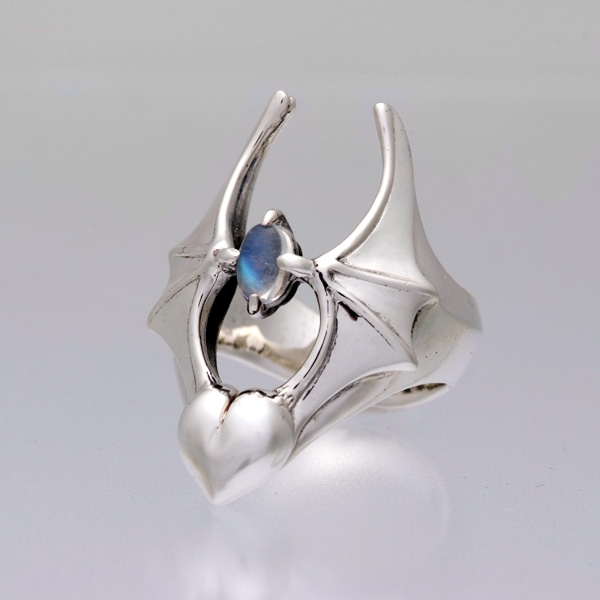 「Pussycub Ring」の指にはめたときの美しいフォルムはそのままに、羽根の間に大きな石を配したバージョン。